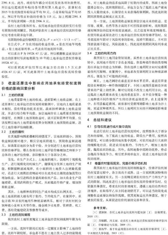 导读:地价评估公司、厂房评估公司在"三权分置"制度改革及农村承包土地经营权流转需求不断增长的背景下,科学评估农村承包土地经营权价值,成为影响农村承包土地经营权流转的关键问题。为了解决我国农村土地承包经营权流转存在的租金评估、抵押评估,选择了应用广泛并行之有效的收益还原法对土地承包经营权流转实例进行验证,并分析土地质量、土地面积、土地流转期限和土地利用方向对土地承包经营权流转价格、土地评估的影响,期望为农村土地承包经营权流转价格评估提供方向。
