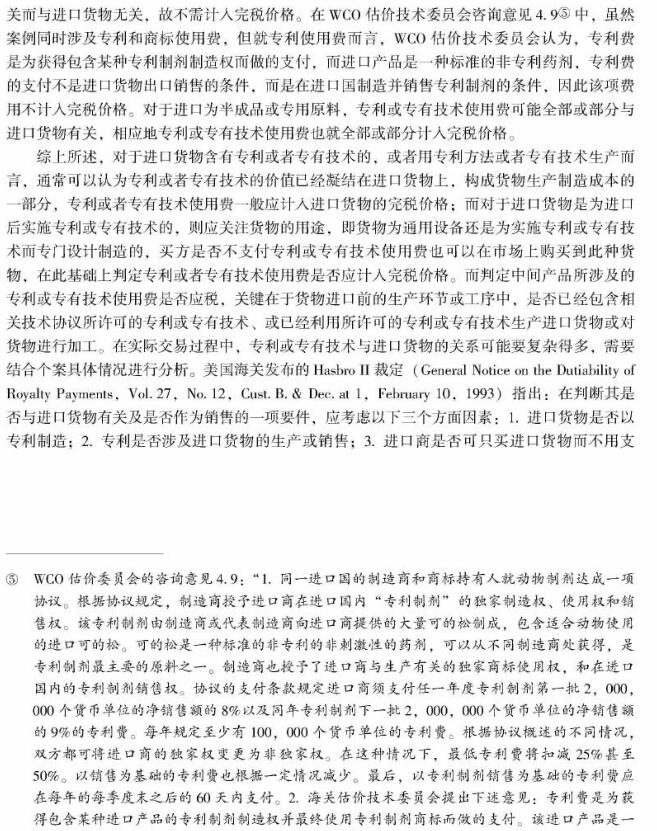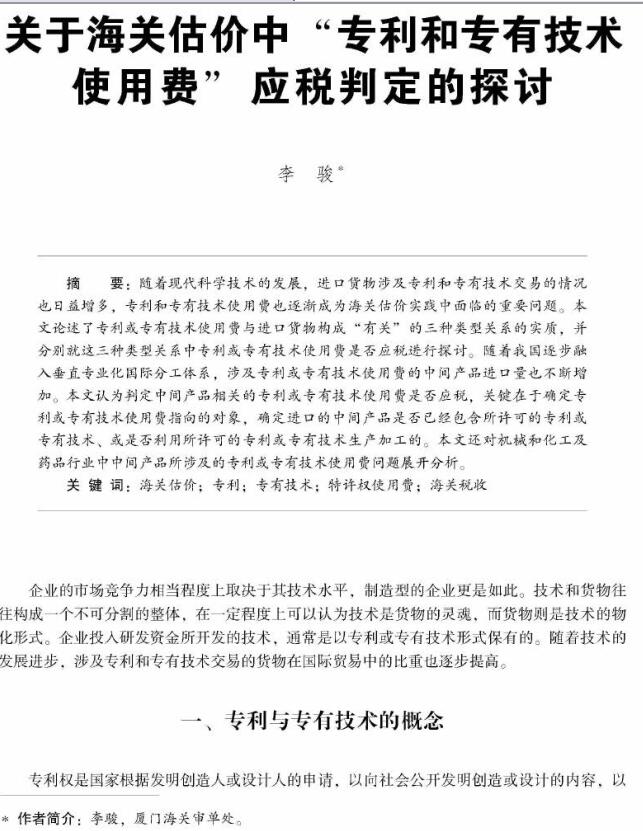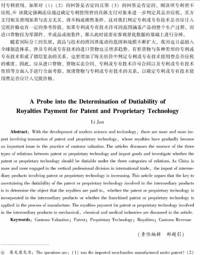 导读:随着现代科学技术的发展,进口货物涉及专利和专有技术交易的情况也日益增多,专利和专有技术使用费也逐渐成为海关估价实践中面临的重要问题.本文论述了专利或专有技术使用费与进口货物构成"有关"的无形资产评估、专利评估、专利价格评估,专利转让评估、专利资产评估单项资产评估三种类型关系的实质,并分别就这三种类型关系中专利或专有技术使用费是否应税进行探讨.随着我国逐步融入垂直专业化国际分工体系,涉及专利或专有技术使用费的中间产品进口量也不断增加      .本文认为判定中间产品相关的专利或专有技术使用费是否应税,关键在于确定专利或专有技术使用费指向的对象,确定进口的中间产品是否已经包含所许可的专利或专有技术,或是否利用所许可的专利或专有技术生产加工的.本文还对机械和化工及药品行业中中间产品所涉及的专利或专有技术使用费问题展开分析. |