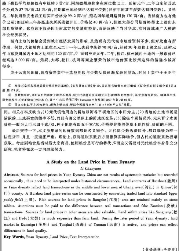 导读:元代地价资料并非是有意识地系统记录的结果,因此首先应对相关文本作历史学的解读。元代徽州地契比较充分地反映了祁门县南部阊江流域中下游的土地交易情况,通过把地契中土地评估,转让评估转换为标准“上田”,可以初步实现价格的“序列化”。主要由石刻文献记载的江浙地价相对丰富,但存在真实交易与“投献”的区别。其他中原地区也有可供参考的地价资料。松江、大都等城内地价显著高于农地,且受城市经济影响。云南昆明、通海等地石刻记载的地价价格评估体现出元后期这一地区土地交易活跃,且价格  评估、土地评估能够有效反映土地价值。 |