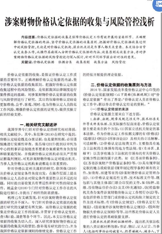 导读:无形资产评估报告价格认定依据的收集是保障价格认定工作有效开展的首要环节。正确理解整体资产评估公司价格认定依据的内涵、坚守价格认定依据的收集原则、把握好价格认定依据收集过程中的风险管控,无论是对价格认定机构、提出机关还是当事人都至关重要。本文结合企业价值评估日常认定业务工作,从操作层面深入分析价格认定依据的内涵、收集原则及收集方法,并对涉案财物价格认定依据的风险管控进行深入探讨,针对股权转让评估不同环节提出针对性的意见。