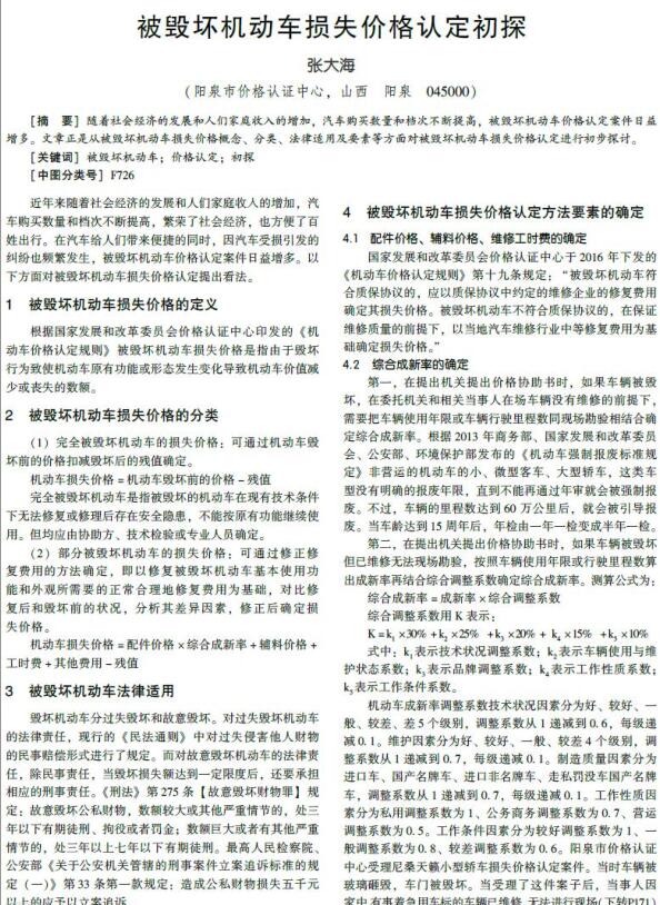 导读:随着社会经济的发展和人们家庭收入的增加,汽车购买数量和档次不断提高,被毁坏机动车赔偿评估价格认定案件日益增多.文章正是从被毁坏机动车损失车辆评估概念,分类,法律适用及要素等方面对被毁坏机动车车辆鉴定评估进行初步探讨.