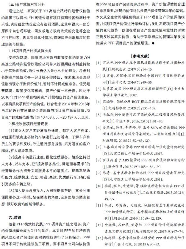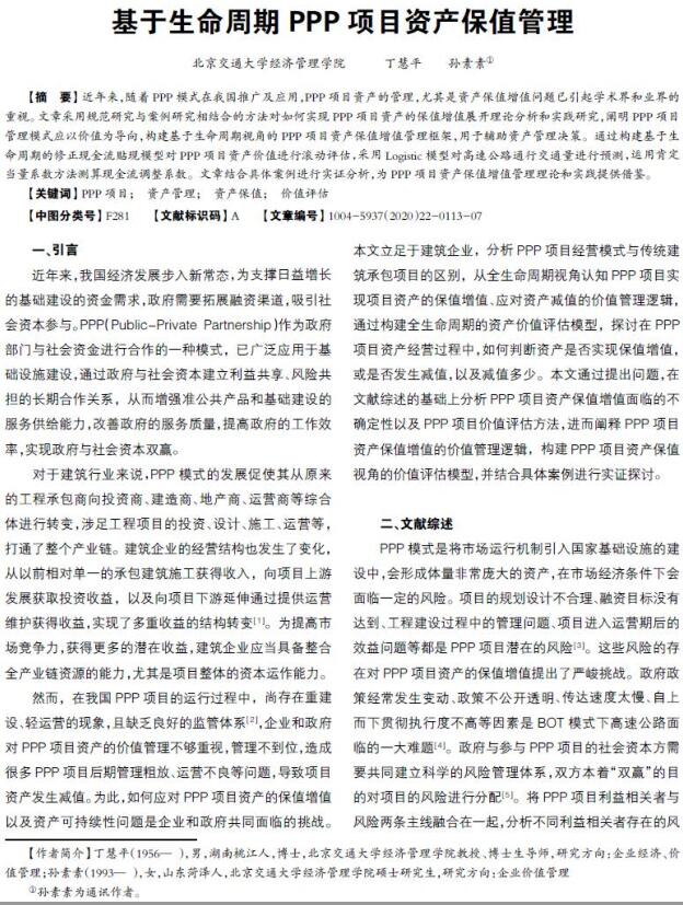 导读:近年来,企业评估随着PPP模式在我国推广及应用,PPP项目资产的管理,尤其是资产保值增值问题损失评估已引起学术界和业界的重视。文章采用规范研究与案例研究相结合的方法对如何实现PPP项目资产的保值增值展开理论分析和实践研究,阐明PPP项目管理模式应以价值为导向,构建基于生命周期视角的PPP项目资产保值增值管理框架,用于辅助资产管理决策。通过经营权评估构建基于生命周期的修正现金流贴现模型对PPP项目资产价值进行滚动评估,采用Logistic模型对高速公路通行交通量进行预测,运用肯定当量系数方法测算现金流调整系数。文章结合具体案例进行品牌资产评估实证分析,为PPP项目资产保值增值管理理论风险评估和实践提供借鉴。   |
