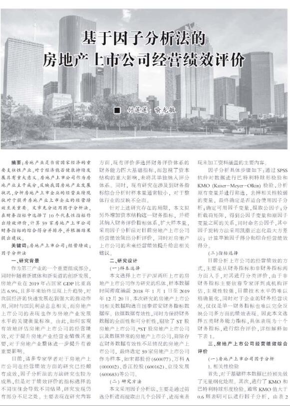 导读:房地产业是当前国家经济的重要支柱性产业,对于经济能否健康持续发展具有重大意义。房地产上市公司项目风险评估、整体资产价值评估作为房地产业主干成分,反映我国房地产业质押评估发展状况,分析房地产上市企业企业品牌资产评估的拍卖评估经营业绩现状对于提升房地产业上市企业的经营绩效至关重要。文章充分运用因子分析法,在财务指标中选择了10个代表性指标作出绩效评价,计算59家房地产上市公司财务指标的综合得分并排序,并根据结果提出建议。