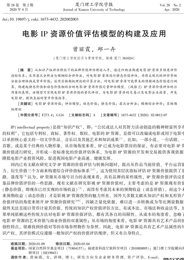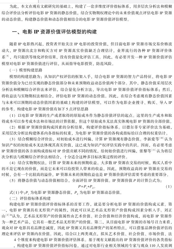 导读:企业知识产权评估公司从知识产权评估理论下的品牌价值评估理论入手,通过归纳法构建电影IP资源多维度评价指标体系;采用层次分析法与模糊综合评价法,对电影IP资源进行静态价值评估,并将主观化的评价等级分数合理转换成货币价值;运用实物期权理论的计算方法,对电影IP资源可能带来的预期动态价值进行测算,构建起静态价值和动态价值相结合的电影IP资源价值定量评估模型。《战狼2》IP资源价值评估的应用案例表明,该模型可实现电影IP资源价值的量化评估、专利技术资产评  .jpg)  估,为电影IP资源的交易以及电影企业投资、开发电影IP,提供直接的货币价值指导。 |