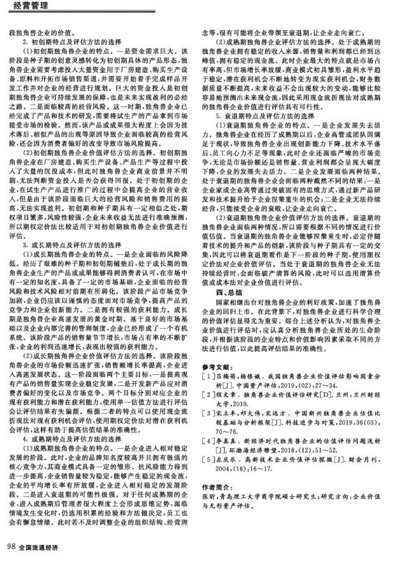 导读:无形资产评估公司随着我国新经济的不断发展,以创新为代表的独角兽企业异军突起,引起了全球范围内的广泛关注。独角兽企业的独特特征导致传统版权评估、技术评估、股权评估评估方法在运用时存在困难。因此,本文在了解独角兽企业价值评估研究现状的基础上,提出结合生命周期理论对独角兽企业进行估值,通过分析处于各生命阶段独角兽企业的特点,展开对独角兽企业各生命阶段价值评估的研究。