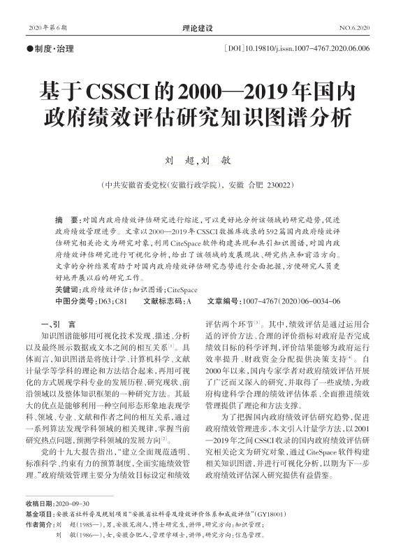 导读:无形资产评估公司对国内政府绩效评估研究进行综述,可以更好地分析该领域的研究趋势,促进政府绩效管理进步。文章以2000—2019CSSCI数据库收录的592篇国内政府绩效评估技术评估、企业价值评估研究相关论文为研究对象,利用CiteSpace软件构建共现和共引知识图谱,对国内政府绩效评估研究进行可视化分析,给出了该领域的发展现状、研究热点和前沿方向。文章的分析结果有助于对国内政府绩效评估究态势进行全面把握,方便研究人员更好地开展以后的研究工作。