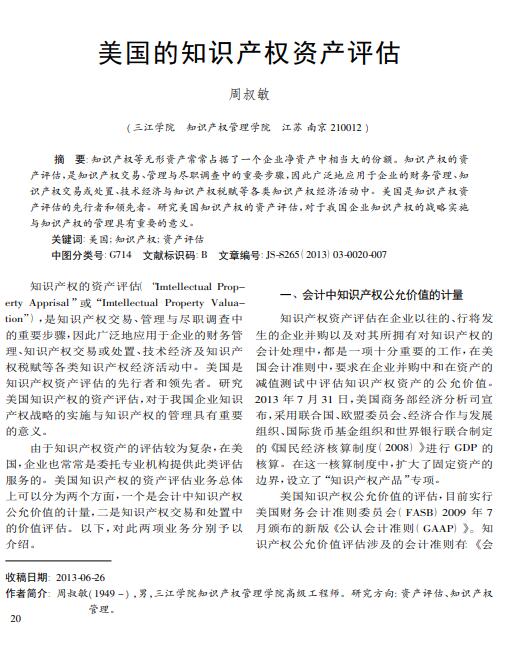 导读:知识产权评估、软件著作权评估、商标价值评估等无形资产常常占据了一个企业净资产中相当大的份额。知识产权的资产评估、专利评估,是知识产权交易、管理与尽职调查中的重要步骤,因此广泛地应用于企业的财务管理、知识产权交易或处置、技术经济与知识产权税赋等各类知识产权经济活动中。美国是知识产权资产评估的先行者和领先者。研究美国知识产权的资产评估,对于我国企业知识产权的战略实施与知识产权的管理具有重要的意义。