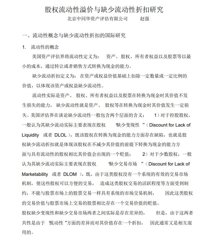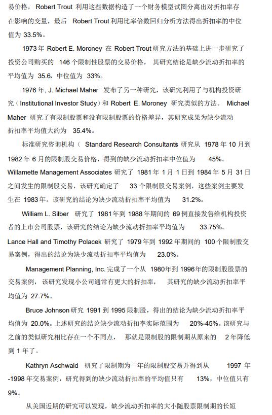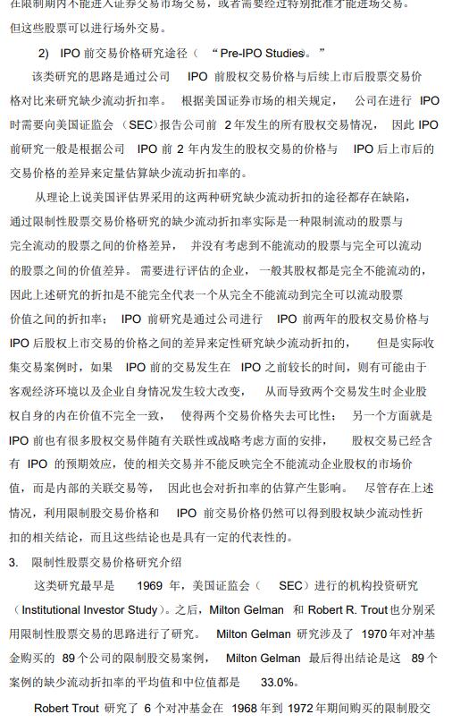 导读:股权评估公司对该类研究的思路是通过公司IPO前股权交易价格与后续上市后股票交易股权评估价格对比来研究缺少流动折扣率。根据美国证券市场的相关规定,股权价值评估公司在进行IPO时需要向美国证监会(SEC)报告公司前2年发生的所有股权价值评估情况,因此股权转让评估公司IPO前研究一般是根据公司IPO前2年内发生的股权交易的价格与IPO后上市后的交易价格的差异来定量估算缺少流动折扣率的。(作者:赵强)