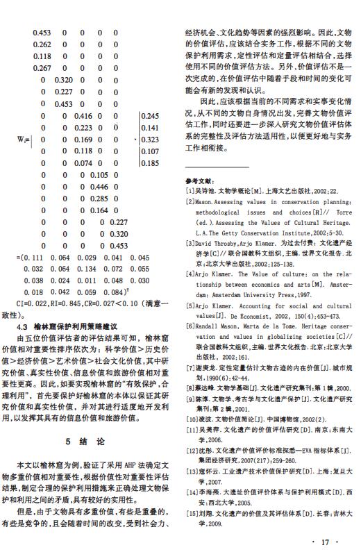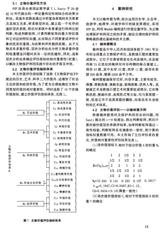 导读:本研究针对国内文物价值资产评估存在的问题,建立文物价值评估指标体系,尝试采用AHP法,利用Matlab编程进行文物价值机器设备评估,以榆林窟为例,根据评估资产得出字画评估,书画评估,艺术品评估价值相对重要性,提出保护利用措施与建议,为正确处理文物保护和利用的矛盾,制定合理的保护利用策略提供理论基础和技术支撑,同时,此方法不但可供其他文物开展价值评估借鉴和参考,而且还为类似文物价值定量评估提供了典型案例。