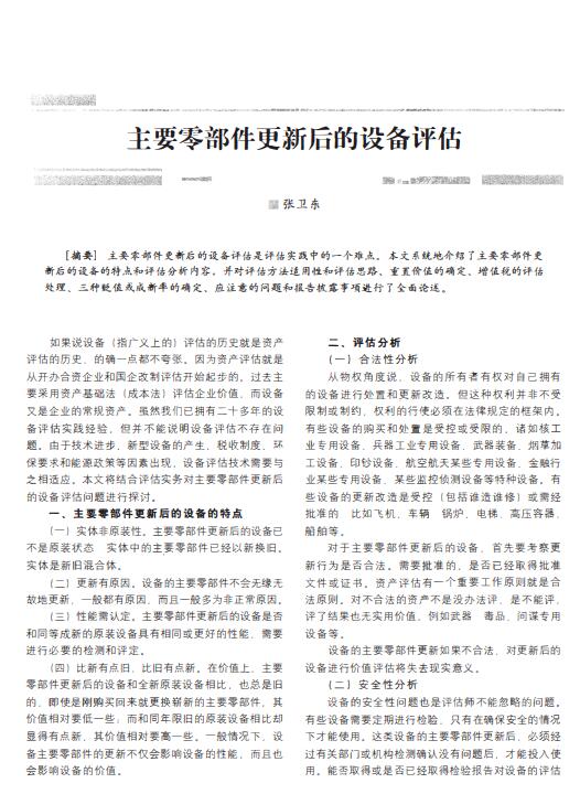 导读:机器设备评估公司对机器设备评估主要零部件更新后的设备评估是评估实践中的一个难点。本文系统地介绍了主要零部件更新后的设备的设备评估特点和评估分析内容,整体资产评估公司并对评估方法适用性和评估思路、重置价值的确定、增值税的评估处理、三种贬值或成新率的确定、评估公司应注意的问题和报告披露事项进行了全面论述。如果说设备(指广义上的)评估的历史就是资产评估的历史的确一点都不夸张。因为资产评估就是从开办合资企业和国企改制评估开始起步的。过去主要采用资产基础法(成本法)评估企业价值,而设备又是企业的常规资产。虽然我们已拥有二十多年的设备评估实践经验,但并不能说明设备评估不存在问题。由千技术进步新型设备的产生、税收制度环保要求和能源政策等因素出现设备评估技术需要与之相适应。本文将结合评估实务对主要零部件更新后的设备评估问题进行探讨。