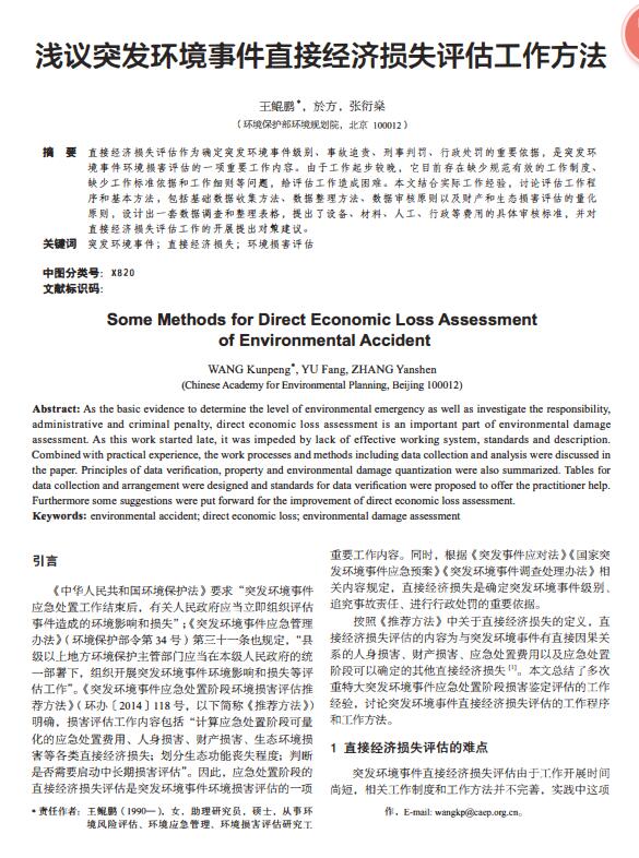 导读:直接经济损失评估作为确定突发环境事件级别、事故追责、刑事判罚、行政处罚的财产损失评估重要依据,损失评估是突发环境事件环境损害评估的一项重要工作内容。财产损失评估公司由于工作起步较晚,它目前存在缺少规范有效的工作制度、缺少工作标准依据和工作细则等问题,给评估工作造成困难。本文结合实际工作经验,讨论风险评估工作程序和基本方法,赔偿评估包括基础数据收集方法、数据整理方法、数据审核原则以及财产和生态损害评估的量化原则,项目风险评估设计出一套数据调查和整理表格,财产纠纷评估提出了设备、材料、人工、行政等费用的具体审核标准,并对直接经济损失评估工作的开展提出对策建议。   |
