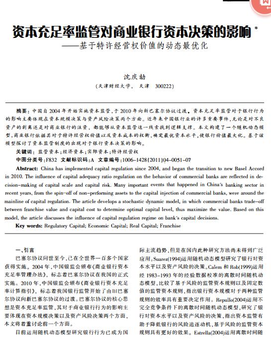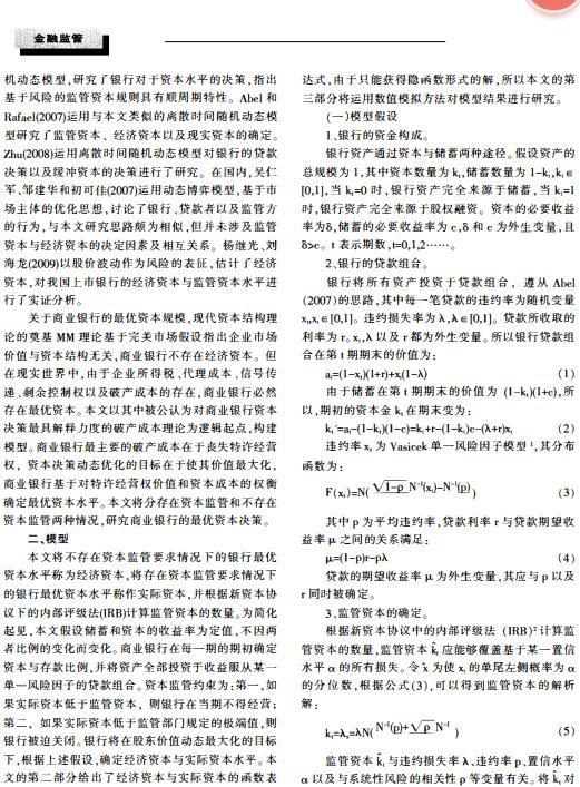 摘要:中国自2004年开始实施资本监管,于2010年向新巴塞尔协议过渡。资本充足率监管对于银行行为的影响主要体现在资本规模决策与资产风险决策两个方面。近年来中国银行业的许多重要事件,无论是对不良资产的剥离还是对商业银行的注资,都能够从资本监管这一线索找到逻辑支撑。本文构建了一个随机动态模型,商业银行依据其对于特许经营权价值评估,厂房价值评估,房屋价值评估,装修评估,机器评估价值以及资本成本的权衡,确定最优资本水平,使银行价值最大化。基于该模型探讨了资本监管制度的出现对于银行资本决策的影响。