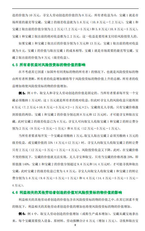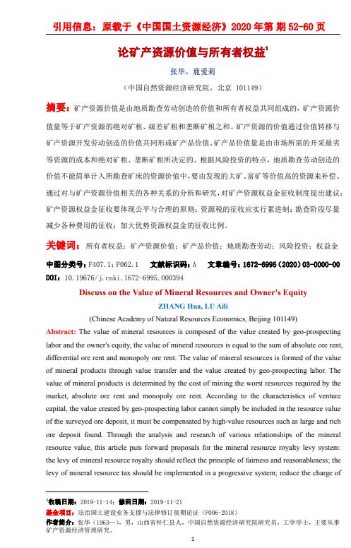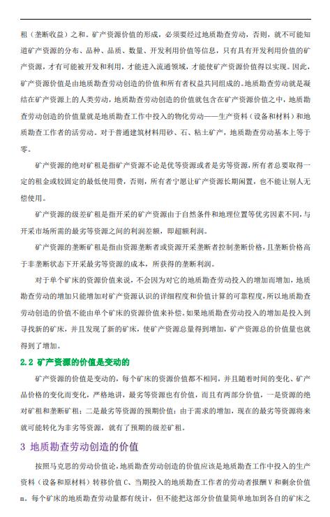 导读:探矿权评估,自然资源评估是由地质勘查劳动创造的价值和所有者权益共同组成的,矿产资源价值量等于矿产资源的绝对矿租、级差矿租和垄断矿租之和。矿产资源的价值通过价值转移与矿产资源开发劳动创造的价值共同形成矿产品价值。矿产品价值特许经营权评估量是由市场所需的开采最劣等资源的成本和绝对矿租、垄断矿租所决定的。根据风险投资的特点,地质勘查劳动创造的价值不能简单计入所勘查矿床的资源价值中,价格评估机构要由发现的大矿、富矿等价值高的经营权评估资源来补偿。通过对与矿产资源价值相关的各种关系的分析和研究,对矿产资源权益金征收制度提出建议:矿产资源权益金征收要体现公平与合理的原则;资源税的征收应实行累进制;勘查阶段尽量减少各种费用的征收;加大优势资源权益金的征收比例。    |