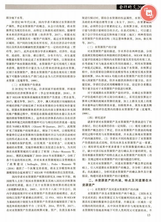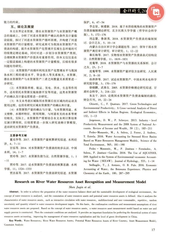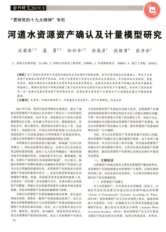 导读:资产评估公司为了实现水资源资产负债表的编制及生态环境的土地评估,地价评估可持续发展,在对水资源概念分析基础上,自然资源评估界定了水资 源资产及潜在水资源资产的内涵,分析了水资源资产具有与水资源的交互循环性、多功能性及非消耗性、重复 利用性、特许经营权评估随机不确定性以及数量与水资源开发目标有关等特点;在提出河道水资源资产的确认条件及计量假设 的基础上,根据水资源资产的概念构建了基于使用及供水过程的河道水资源资产计量模型,并分析了其约束条 件。这一成果为完善水资源资产核算理论体系、提高我国水资源资产化管理水平以及绿色发展水平提供重要基础。   |