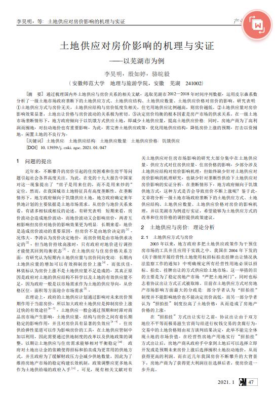 导读:土地评估公司通过梳理国内外土地供应与房价关系的相关文献,选取芜湖市2012—2018年时间序列数据,运用皮尔森系数分析了一级土地市场政府垄断下的土地评估土地供应方式、土地供应结构、土地供应数量、土地供应价格对房价的影响。个人资产评估研究表明:①土地供应方式与个人房产评估房价无关,土地供应结构与房价低度负相关,住宅用地供应比例越高,则房价越低。②土地供应量对房价影响效果显著,土地出让价格与房价波动的关系极为密切。③决定房价均衡的根本因素是房产市场的供求关系,在一级土地市场垄断情形下,地方政府倾向于以饥饿方式供应土地,即减少土地供应量,提高土地供应价格;同时,房地产商为了高利润而囤地,房屋价格评估对拉动地价也有重要影响。为此,需完善土地供应政策,优化用地供应结构,降低房价上涨的预期,打击以资囤地、闲置土地的不良行为。   |