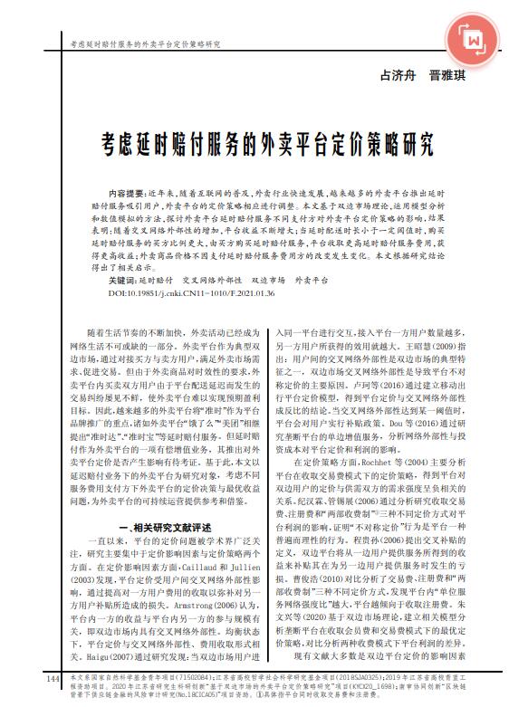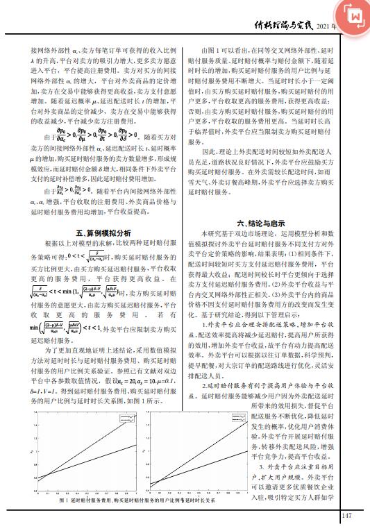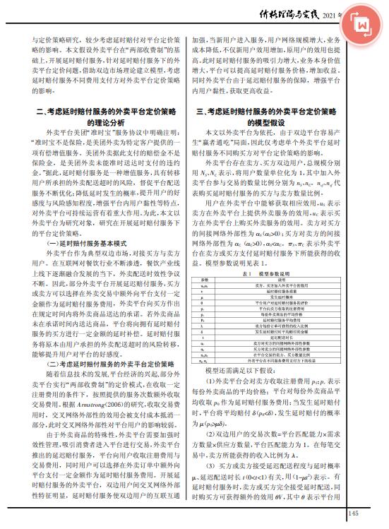 导读: 近年来,随着互联网的普及,外卖行业技术评估快速发展,越来越多的外卖平台推出延时赔付服务吸引用户,外卖平台的定价策略相应进行调整。本文基于双边市场理论,账外资产评估运用模型分析和数值模拟的方法,探讨外卖平台延时赔付服务不同支付方对外卖平台定价策略的影响,价格评估结果表明:评估资产随着交叉网络外部性的增加,平台收益不断增大;当延时配送时长小于一定阈值时,购买延时赔付服务的买方比例更大,由买方购买延时赔付服务,平台收取更高延时赔付服务费用,资产价值评估获得更高收益;外卖商品价格不因支付延时赔付服务费用方的改变发生变化。本文根据研究结论得出了相关启示。   |