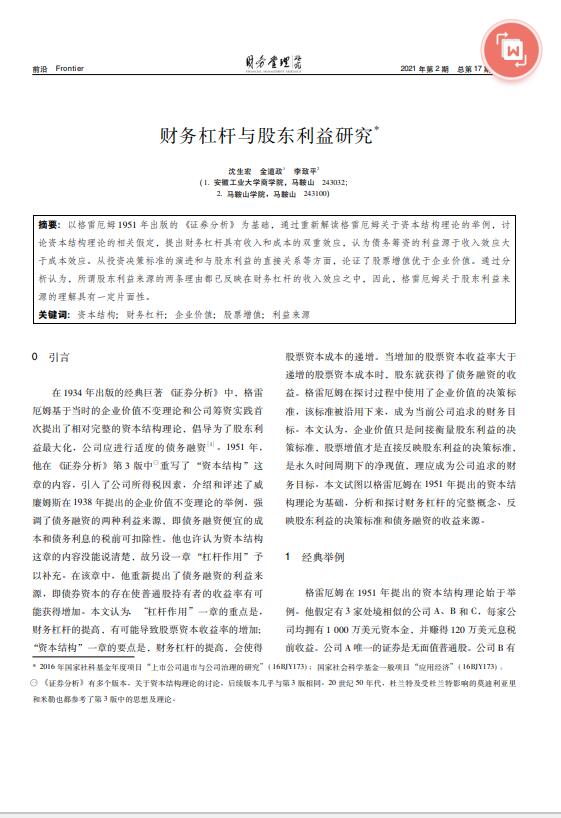 导读:会计报表审计,财务报表审计以格雷厄姆1951年出版的《证券分析》为基础,通过重新解读格雷厄姆关于资本结构理论的举例,资产评估机构讨论资本结构理论的相关假定,整体资产评估提出财务杠杆具有收入和成本的双重效应,认为专利权评估债务筹资的利益源于收入效应大于成本效应。从投资决策标准的演进和与股东利益的直接关系等方面,论证了股票增值优于企业价值。通过分析认为,所谓股东利益来源的两条理由都已反映在财务杠杆的收入效应之中,因此,格雷厄姆关于股东利益来源的理解具有一定片面性。