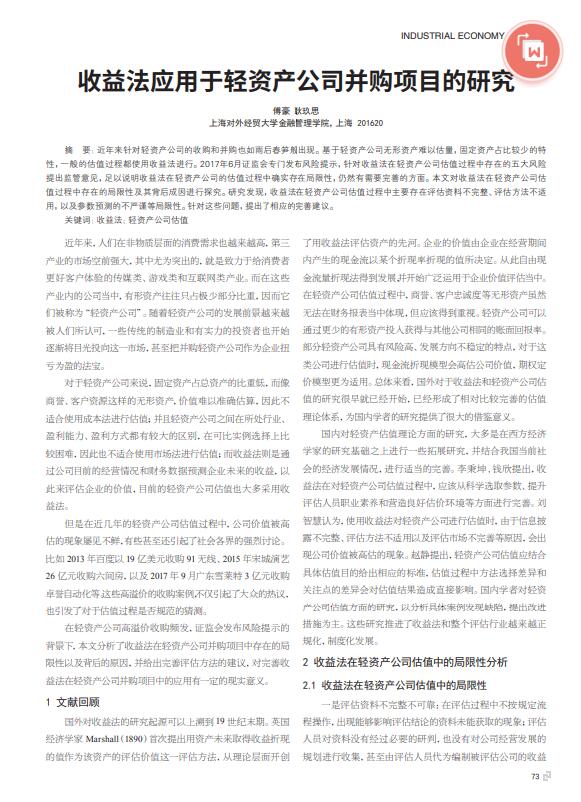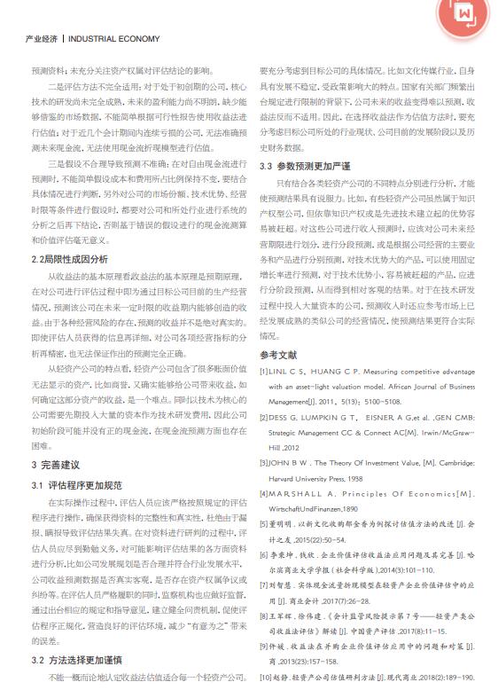 导读:资产评估公司,无形资产评估公司近年来针对轻资产公司的收购和并购也如雨后春笋般出现。评估,商标评估基于轻资产公司无形资产难以估量,整体资产评估固定资产占比较少的特性,一般的估值过程都使用收益法进行。2017年6月证监会专门发布风险提示,针对收益法在轻资产公司估值过程中存在的五大风险提出监管意见,足以说明收益法在轻资产公司的估值过程中确实存在局限性,仍然有需要完善的方面。本文对收益法在轻资产公司估值过程中存在的局限性及其背后成因进行探究。研究发现,收益法在轻资产公司估值过程中主要存在评估资料不完整、评估方法不适用,以及参数预测的不严谨等局限性。针对这些问题,提出了相应的完善建议。   |