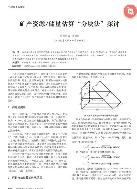 导读:本文资产评估机构,资产评估公司首先通过实例对矿产资源/储量估算方法中的“分块法”进行了分析,资产评估提出“分块法”与“整体法”存在着固定资产评估本质差别,二者不能相互代替。然后举例对上述探讨进行进一步验证,最后得出采矿权评估结论:造成“分块法”与“整体法”估算结果误差的最根本原因是参与资源/储量估算的见矿工程数据的利用率不同。些大矿块划分成许多小的块段。我们通常先计算这些小块段的资源/储量,然后累加起来,用累加的资源/储量结果作为大矿块的矿体资源/储量;这种方法就是本文所提到的“分块法”。对于资源/储量估算的任何方法来说,其估算结果难免都会出现误差。对于一个矿山企业来说,资源/储量估算的误差,将会带来严重的经济后果。笔者认为:认清“分块法”与“整体法”的本质区别是很有必要的。  |
