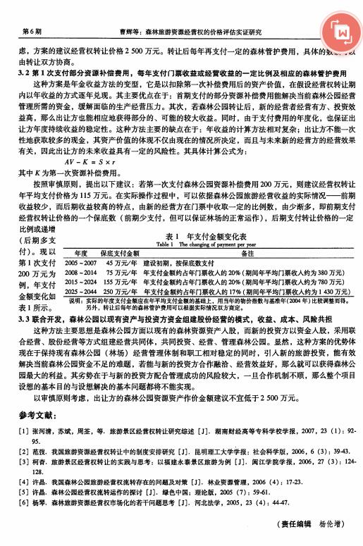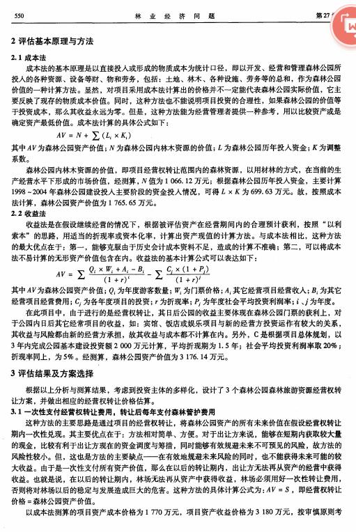 导读:针对森林旅游资源经营权的转让己成为具有一定普遍性的市场现象,自然资源评估,林木评估运用成本法和收益 法,树木评估对某森林公园的旅游资源经营权进行分析计算,测算出森林公园旅游资源经营权的成本价 值为1 765.65万元,收益价值为3 176.14万元,并依据市场交易的不同情况,树林评估提出3种不同 的转让思路和方案。 上海资产评估这种方法主要思想是森林公园方面以现有的森林资源资产人股,而新的投资方以资金人股,采用联 合经营、股份经营等方式组建经营共同体,共同投资、经营、管理森林公园。显然,价格评估机构这种方案的优势体 现在于保持现有森林公园(林场)经营管理体制和职工相对稳定的同时,引入新的旅游投资,能有效 解决当前森林公园资金不足的难题,若能与新的投资方合作融洽、经营效益好,那么就可以获得森林公 园最大的利益。其劣势在于与新的投资方配合管理成功的风险较大,一旦合作机制不顺,那么整个项目 设想的基本目的与设想解决的基本问题都将不能实现。    |