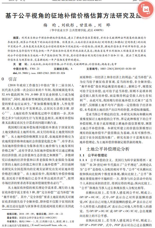 导读: 利用亚当斯公平理论和耕地价值构成,建立了耕地价值估算模型,并结合文献调研法所搜集的数据进行参数估算,土地评估测算公平视角下的征地补偿价格。结果显示:土地补偿应该在纵向(时间维度)和横向(空间维度)的比较中实现房地产评估公平,固定资产评估具体表现为采取完全补偿的原则和不同地区统一补偿标准;经测算,耕地价值体系中的房屋评估市场价值、社会价值和生态价值均可用包含统一年产值标准和还原利率的函数式表达;湖南省皂市水利枢纽工程淹没区和安置区的公平补偿价格为当地统一年产值标准的78.35倍,房产评估公司其补偿价格分别为赔偿评估现行标准的5倍和11倍。提出了规范耕地价值体系与测算标准、完善耕地统一年产值相关资料的建议。