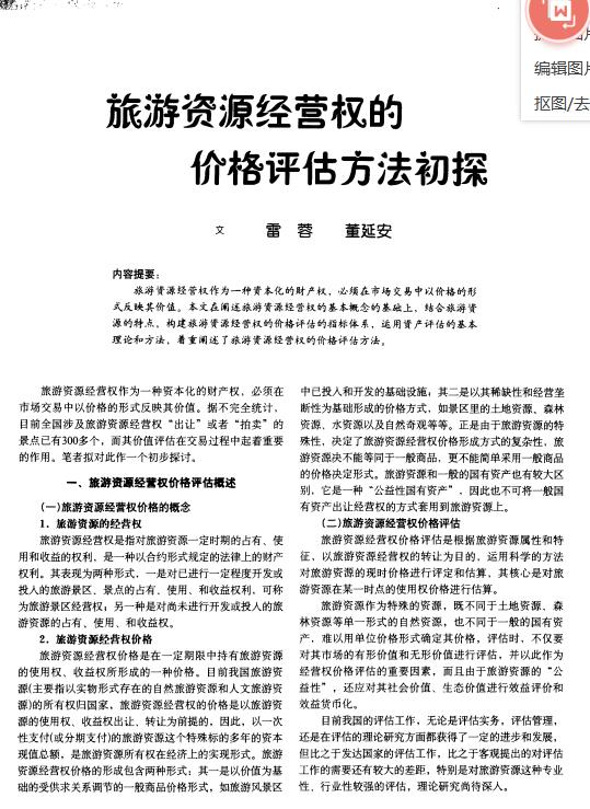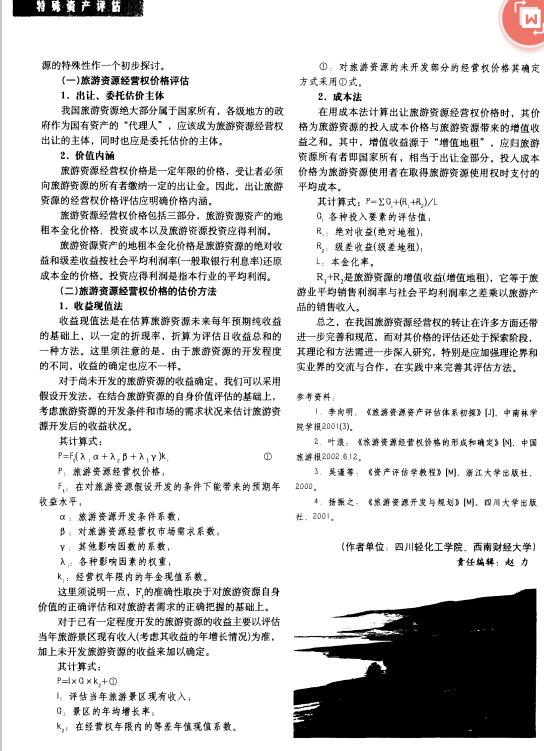 导读:旅游资源经营权作为一种资本化的财产权,特许经营权评估,经营权评估必须在市场交易中以价格的形 式反映其企业评估价值。本文资产价值评估在阐述旅游资源经营权的基本概念的基础上,结合旅游资 源的特点,构建旅游资源经营权的价格评估的指标体系,运用专有技术评估资产评估的基本 理论和方法,着重阐述了旅游资源经营权的价格评估方法。