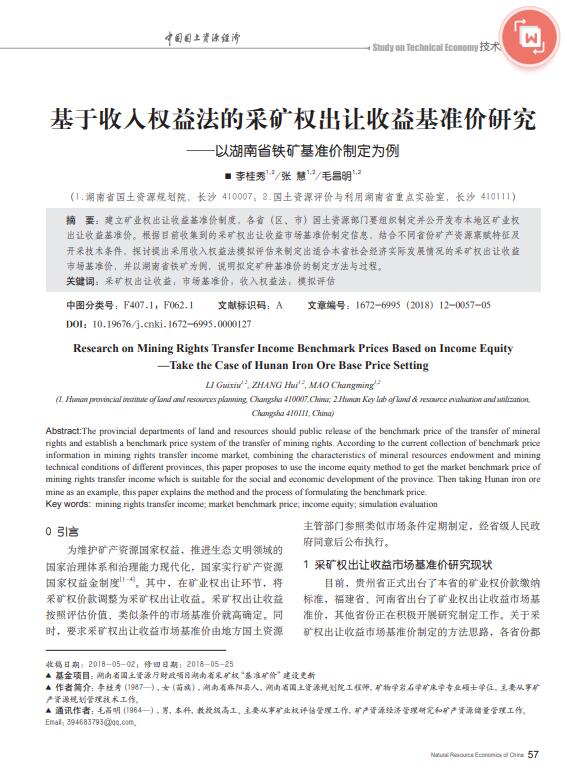导读 :建立矿业权出让收益基准价制度,各省(区、市)国土资源部门要组织制定并公开发布本地区探矿权评估矿业权出让采矿权评估收益基准价。根据目前收集到的采矿权出让收益市场基准价制定信息,自然资源评估结合不同省份矿产资源禀赋特征及开采技术条件,特许经营权评估探讨提出采用收入权益法模拟评估来制定出适合本省社会经济实际发展情况的采矿权出让收益市场基准价,并以湖南省铁矿为例,经营权评估说明拟定矿种基准价的制定方法与过程。