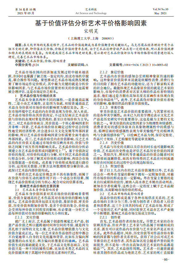 导读: 资产评估在文化市场的发展过程中,设备评估公司艺术品的价值逐渐成为其价值衡量的关键标尺。马克思商品经济理论中有个永恒不变的定律,固定资产评估即价值决定价格,价格是价值的货币表现,技术评估由于艺术品这种劳动产品具有一定特殊性,评估公司所以其价值规律和特点的表现较为复杂。为促进我国艺术品市场更好发展,价格评估公司有必要对艺术品价值评估与市场价格影响因素进行深入研究,完善艺术品市场体系。