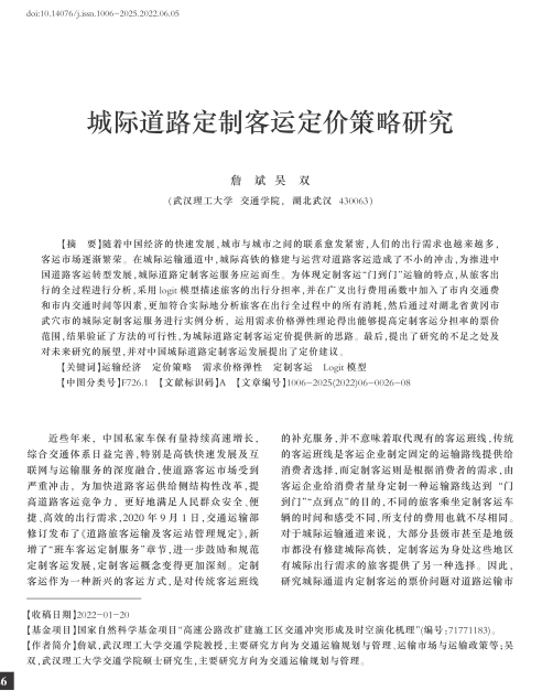 导读:随着中国经济的快速发展,城市与城市之间的评估机构联系愈发紧密,人们的出行需求也越来越多,客运市场逐渐繁荣。 在城际运输通道中,城际高铁的修建与运营对道路客运造成了不小的冲击,地价评估为推进中国道路客运转型发展,城际道路定制客运服务应运而生。 股权评估,为体现定制客运“门到门”运输的特点,从旅客出行的全过程进行分析,无形资产评估采用 logit 模型描述旅客的出行分担率,并在广义出行费用函数中加入了市内交通费和市内交通时间整体资产评估公司等因素,更加符合实际地分析旅客在资产评估公司出行全过程中的所有消耗,然后通过对湖北省黄冈市武穴市的城际定制客运服务进行实例分析, 运用需求价格弹性理论得出能够提高定制客运分担率的票价范围,结果验证了方法的可行性,为城际道路定制客运定价提供新的思路。 最后,提出了研究的不足之处及对未来研究的展望,并对中国城际道路定制客运发展提出了定价建议。   |