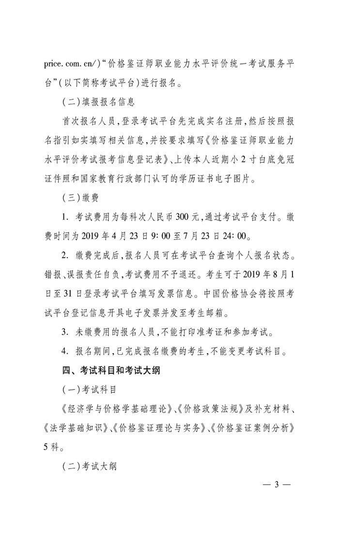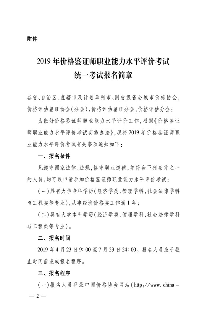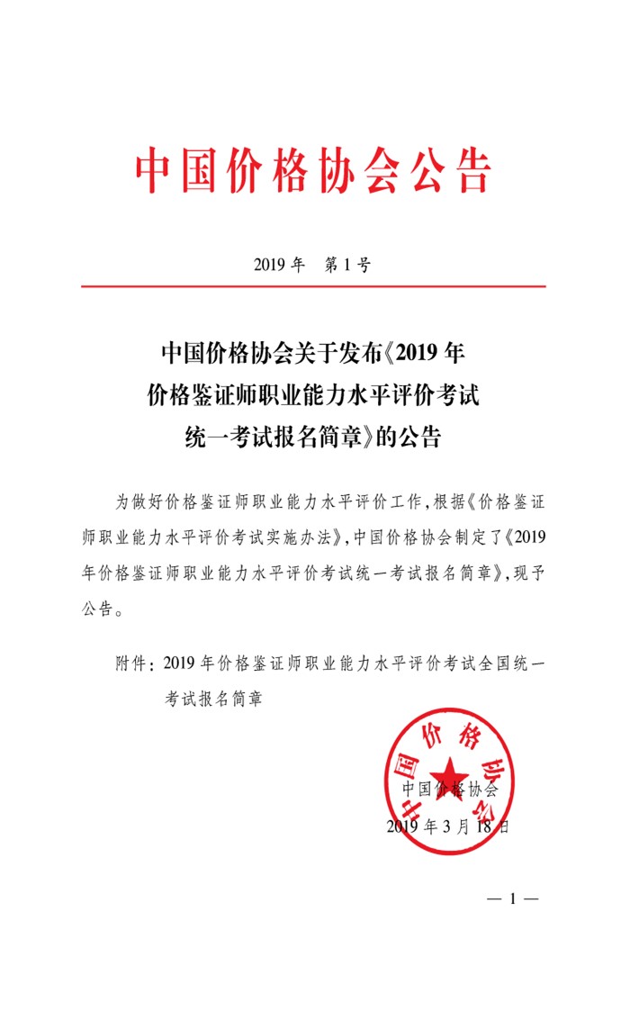 导读:依照国家资产评估法的要求,增强评估公司的职业人员能力和素质,根据《价格评估鉴证专业人员职业能力水平评价认定实施办法》,中国价格协会为了促进价格评估行业的发展,于2019年施行价格鉴证师职业能力水平评价考试工作,中价协制定了《2019年价格鉴证师职业能力水平评价考试统一考试报名简章》,现予公告。