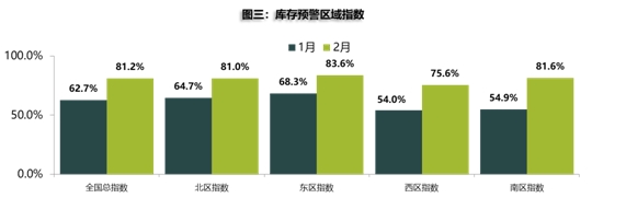 2月份全国总指数为81.2%,各区域库存预警指数上升趋同。(图片来源:中国汽车流通协会官方)