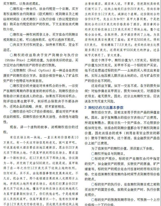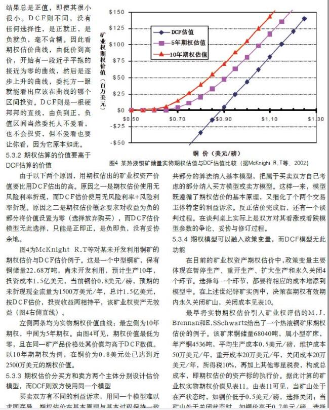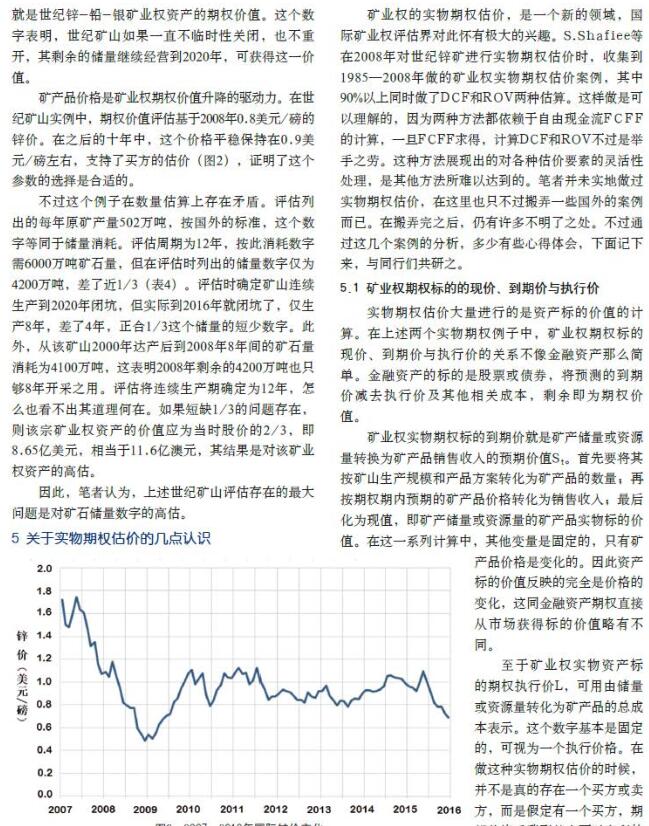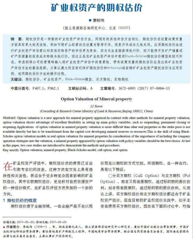 导读: 期权估价是一种新的矿业权资产评估方法。固定资产评估公司同现有的其他评估方法相比,期权估价在设置决策变量方面具有更大的灵活性,例如可将矿山经营状态设置为暂停开采、恢复开采或永久性关闭。应用期权估价法进行矿业权评估、资产评估、整体资产评估、单项资产评估、工程审价、表外资产评估要比对其他实物资产的评估更为复杂,因为无法直接获得执行价,而只能将开发矿产储量或矿产资源量的投资成本转换为执行价。而这正是在矿业权资产评估中使用Black-Scholes期权估价模型的技巧所在。考虑到将公司经营策略融入到矿业权资产评估中的重要性,带有政策变量的期权估价应是这类矿业权资产评估方法的最佳选择。文章以澳大利亚世纪锌矿期权估价和Antucoya斑岩铜矿矿业权资产期权估价为应用实例,说明期权估价方法           |
