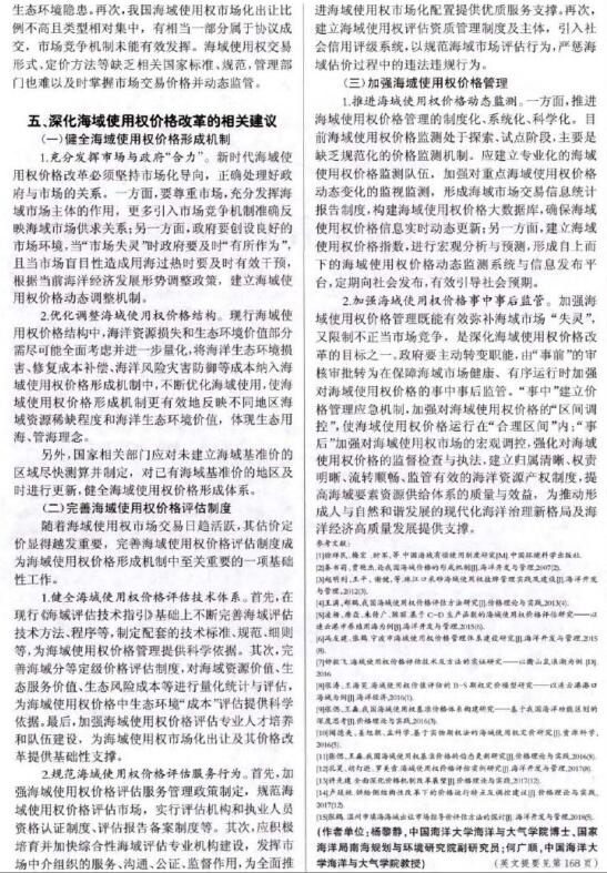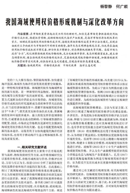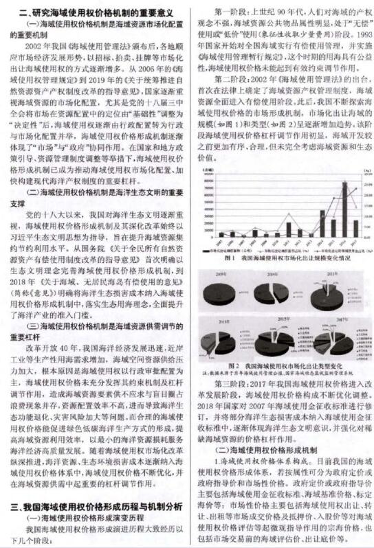导读:在市场配置资源起决定性作用的新时代,加快完善市场竞争性海域使用权价格形成机制,构建权责明晰,流转顺畅的现代海洋产权制度,是海洋市场经济体制改革、价格评估的重点.回顾我国海域使用权价格形成历程,海域使用权价格形成有多种方法与模式,呈现出由政府主导向政府与市场协同作用转变的趋势,海洋生态文明理念越发凸显,但也存在海域使用权价格形成机制不够完善,资产评估体系不够健全,动态调整机制缺失等问题.亟需市场与政府"合力",优化调整海域使用权价格结构,充分反映海洋资源,生态环境损害成本,建立动态调整机制,健全海域使用权价格形成体系,完善海域使用权价格评估制度,加强海域使用权价格管理等系列改革,助推海洋生态文明建设,实现海 .jpg) 洋经济高质量发展. |