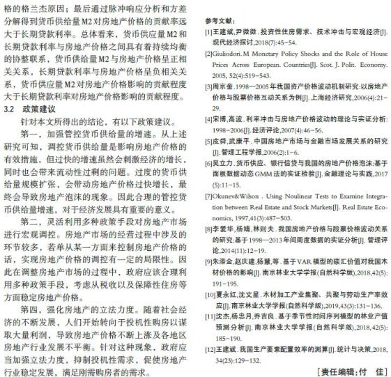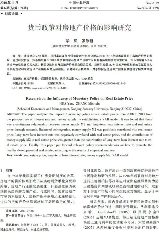 导读:通过建立VAR模型,从利率以及货币供给量两个角度分析从2008-2017年货币政策对于房地产价格的影响,通过研究发现,货币供应量M2和长期贷款利率与房地产价格之间具有着持续均衡的协整联系,货币供给量M2与房地产价格呈正相关关系,长期贷款利率与房地产评估、价格评估呈负相关关系,货币供应量M2对房地产价格影响的贡献程度大于长期贷款利率对房地产价格影响的贡献程度。针对资产评估实证分析结果,对于如何促进房地产健康发展提出了相关政策建议。