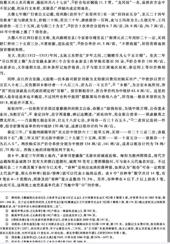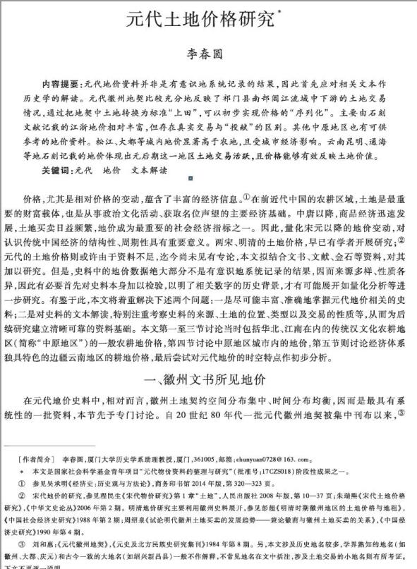 导读:元代地价资料并非是有意识地系统记录的结果,因此首先应对相关文本作历史学的解读。元代徽州地契比较充分地反映了祁门县南部阊江流域中下游的土地交易情况,通过把地契中土地评估,转让评估转换为标准“上田”,可以初步实现价格的“序列化”。主要由石刻文献记载的江浙地价相对丰富,但存在真实交易与“投献”的区别。其他中原地区也有可供参考的地价资料。松江、大都等城内地价显著高于农地,且受城市经济影响。云南昆明、通海等地石刻记载的地价价格评估体现出元后期这一地区土地交易活跃,且价格  评估、土地评估能够有效反映土地价值。 |