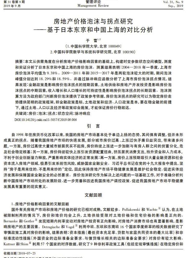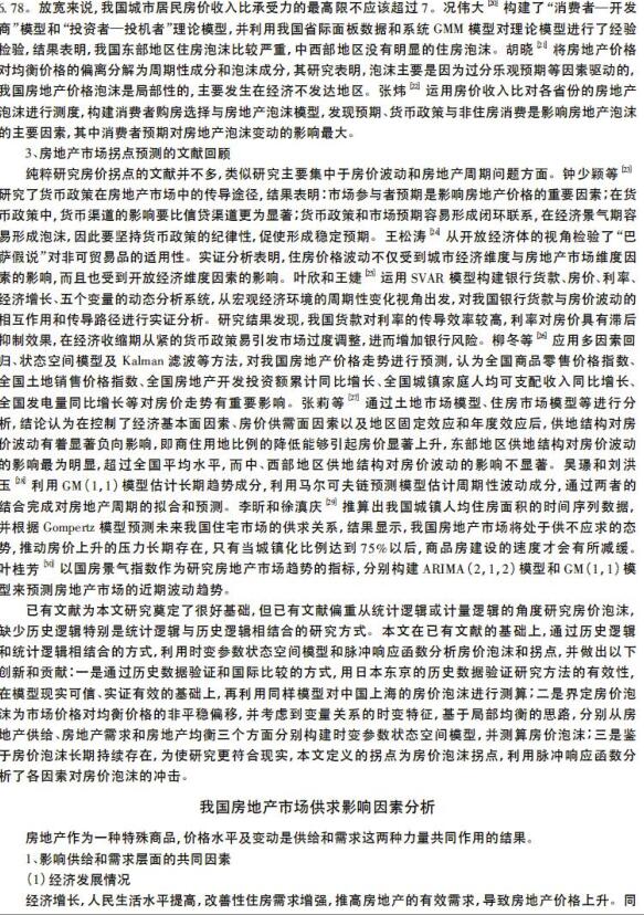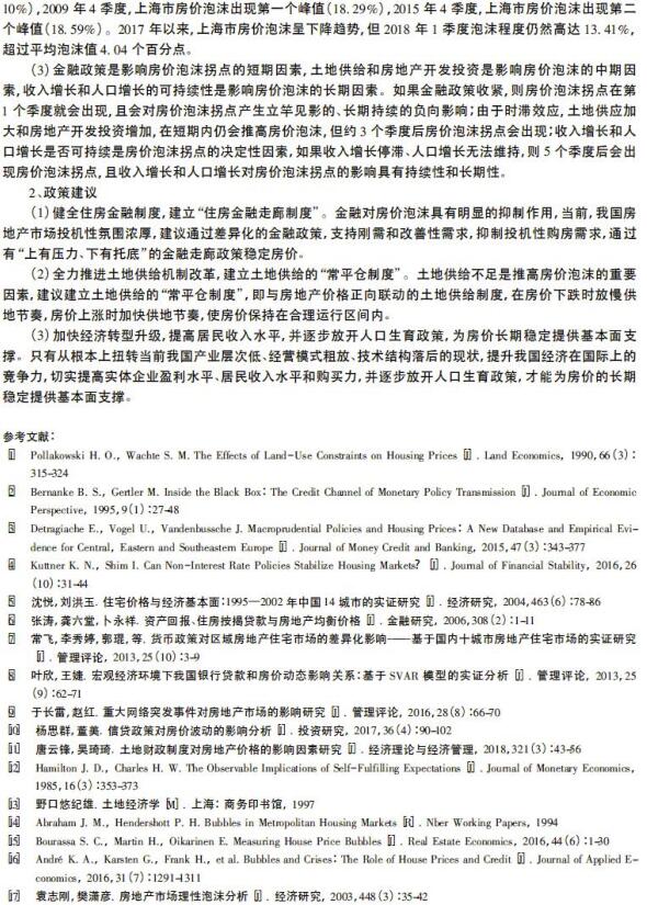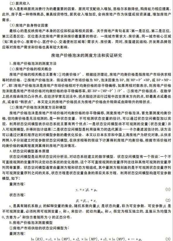 导读:本文从供需角度在分析房地产评估,价格评估,土地评估影响因素的基础上,构建时变参数状态空间模型,测度和实证分析了日本东京和中国上海的房价泡沫。测算结果表明:2004—2018年一季度,上海市房价泡沫平均值为9. 38%。2009—2011年和2015—2017年是两轮泡沫较大的时期,期间泡沫峰值分别达到18. 29%和18. 59%。并通过脉冲响应函数分析了上海市房价泡沫拐点情况,结果发现:金融政策是影响房价泡沫拐点的短期因素,土地供给和房地产开发投资是影响房价泡沫拐点的中期因素,收入增长和人口增长的可持续性是影响房价泡沫拐点的长期因素。泡沫测算方法为政府部门判断房价泡沫提供了政策参考依据,房价泡沫拐点的研究可以为稳定房价走势提供简明的政策框架,即金融政策是标,土地政策和经济、人口政策是本,要在稳金融的前提下,通过土地、人口以及经济等政策综合施策,才能保证房价行稳致远。       |
