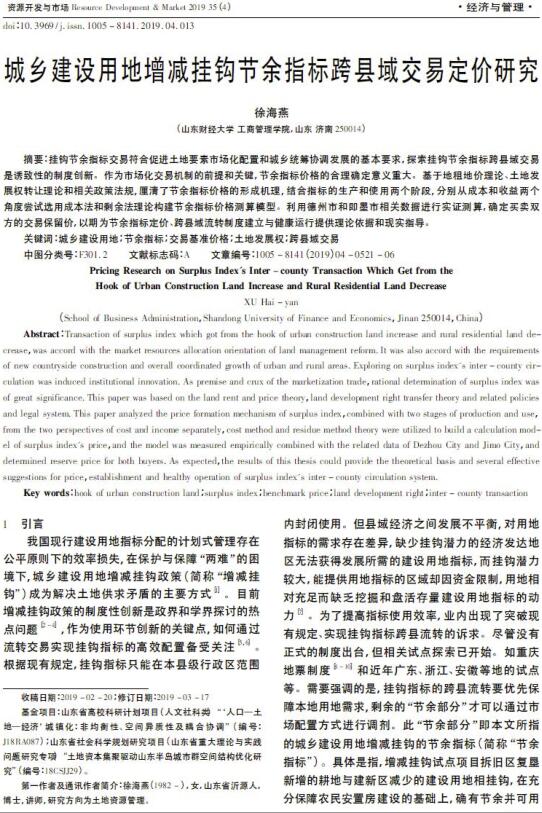 导读:挂钩节余指标交易符合促进土地要素市场化配置和城乡统筹协调发展的基本要求,评估公司探索挂钩节余指标跨县域交易是诱致性的制度创新。作为市场化交易机制的前提和关键,节余指标价格的合理确定意义重大。地价评估公司基于地租地价理论、土地发展权转让理论和相关政策法规,厘清了节余指标价格的形成机理,结合指标的生产和使用两个阶段,分别从成本和收益两个角度尝试选用土地评估成本法和转让评估剩余法理论构建节余指标价格测算模型。利用德州市和即墨市相关数据进行实证测算,确定买卖双方的交易保留价,以期为节余指标定价、跨县域流转制度建立与健康运行提供理论依据和现实指导。   |
