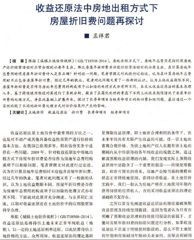 导读:房屋估价公司的房屋价格评估根据《城镇土地估价规程》(GB/T18508-2014),房地出租方式下,房地年总费用是指利用房地产进行经营活动时正常合理的必要年支出,那么房屋估价房屋年折旧费并非进行经营活动时的必要支出,在计算房地年总费用时将财产评估房屋年折旧费计入是否正确?针对这一问题,笔者曾撰文对此进行过论述,认为在计算房地年总费用时不应包含房屋年折旧费。经过几年的执业,笔者对此问题又有了一些新的认识,认为土地收益期限不同,房屋年折旧费是否作为房地年总费用的构成项予以扣除的处理方式亦有所不同。本文从收益还原法的基本原理入手,基于持续使用假设对其进行了系统分析,提出了在简化处理的考虑下不同土地收益期限情况下房屋年折旧费的处理方式,并在此基础上扩展开来,探讨了长寿命项目与短寿命项目的折旧费扣除问题  通过一个实例比较了不同的折旧费处理方式对估价结果所产生的影响。 |