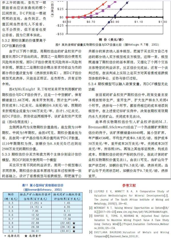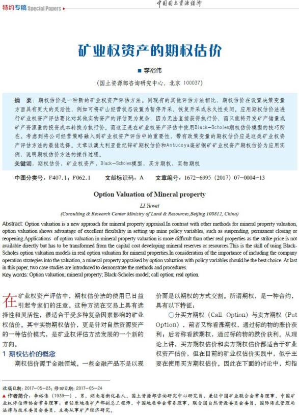 导读:采矿权评估、探矿权评估期权估价是一种新的矿业权资产评估方法。同现有的整体资产价值评估其他评估方法相比,期权估价在设置决策变量方面具有更大的灵活性,例如可将矿山经营状态设置为暂停开采、恢复开采或永久性关闭。应用期权估价法进行矿业权资产评估要比对其他实物资产的评估、权威资产评估、股权估价、股权估值更为复杂,因为无法直接获得执行价,而只能将开发矿产储量或矿产资源量的投资成本转换为执行价。而这正是在矿业权资产评估中使用Black-Scholes期权估价模型的技巧所在。考虑到将公司经营策略融入到矿业权资产评估中的重要性,带有政策变量的期权估价应是这类矿业权资产评估方法的最佳选择。文章以澳大利亚世纪锌矿期权估价和Antucoya斑岩铜矿矿业权资产期权估价为应用实例,说明期权估价方法的操作过程。   |