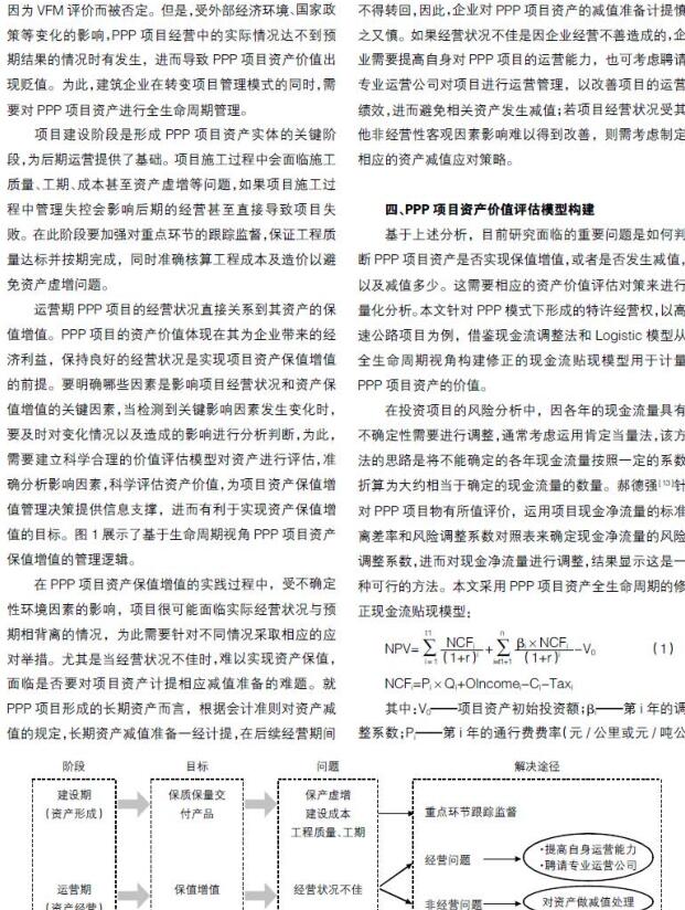 导读:近年来,企业评估随着PPP模式在我国推广及应用,PPP项目资产的管理,尤其是资产保值增值问题损失评估已引起学术界和业界的重视。文章采用规范研究与案例研究相结合的方法对如何实现PPP项目资产的保值增值展开理论分析和实践研究,阐明PPP项目管理模式应以价值为导向,构建基于生命周期视角的PPP项目资产保值增值管理框架,用于辅助资产管理决策。通过经营权评估构建基于生命周期的修正现金流贴现模型对PPP项目资产价值进行滚动评估,采用Logistic模型对高速公路通行交通量进行预测,运用肯定当量系数方法测算现金流调整系数。文章结合具体案例进行品牌资产评估实证分析,为PPP项目资产保值增值管理理论风险评估和实践提供借鉴。   |