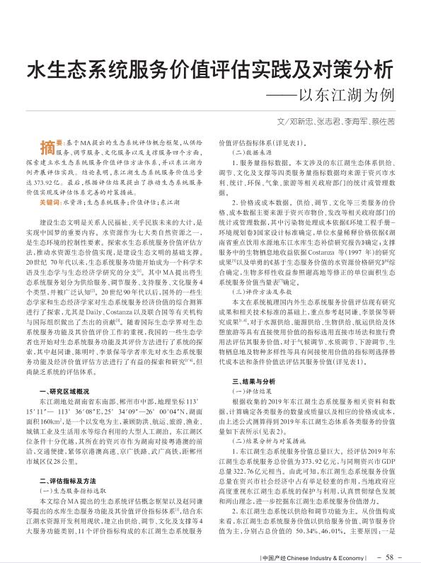 导读:基于MA提出的生态系统评估概念框架,从供给服务、调节服务、文化服务以及支撑服务四个方面,探索建立水生态系统服务价值评估、鱼塘评估方法体系,并以东江湖为例开展评估实践。结论表明,东江湖生态系统服务价值总量达373.92亿。最后,根据非专利评估、特许经营权价值评估、评估结果提出了推动生态系统服务价值实现及评估体系完善的对策措施。