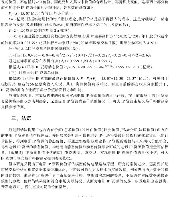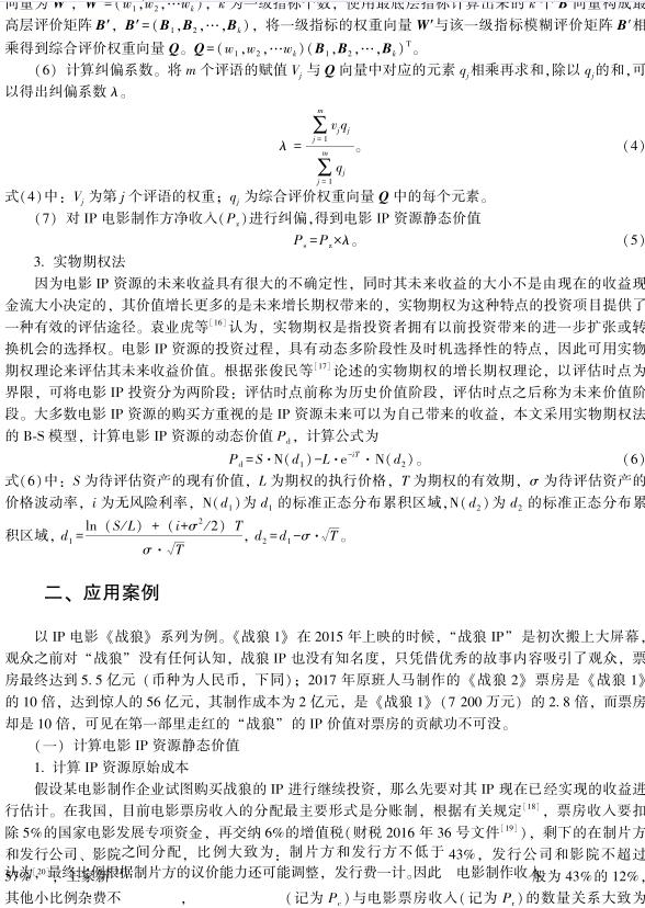 导读:企业知识产权评估公司从知识产权评估理论下的品牌价值评估理论入手,通过归纳法构建电影IP资源多维度评价指标体系;采用层次分析法与模糊综合评价法,对电影IP资源进行静态价值评估,并将主观化的评价等级分数合理转换成货币价值;运用实物期权理论的计算方法,对电影IP资源可能带来的预期动态价值进行测算,构建起静态价值和动态价值相结合的电影IP资源价值定量评估模型。《战狼2》IP资源价值评估的应用案例表明,该模型可实现电影IP资源价值的量化评估、专利技术资产评  .jpg)  估,为电影IP资源的交易以及电影企业投资、开发电影IP,提供直接的货币价值指导。 |