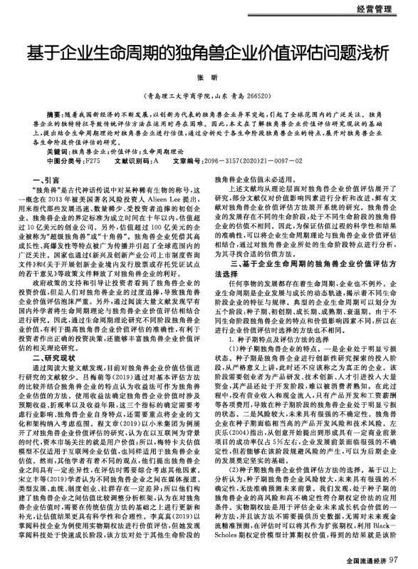 导读:无形资产评估公司随着我国新经济的不断发展,以创新为代表的独角兽企业异军突起,引起了全球范围内的广泛关注。独角兽企业的独特特征导致传统版权评估、技术评估、股权评估评估方法在运用时存在困难。因此,本文在了解独角兽企业价值评估研究现状的基础上,提出结合生命周期理论对独角兽企业进行估值,通过分析处于各生命阶段独角兽企业的特点,展开对独角兽企业各生命阶段价值评估的研究。