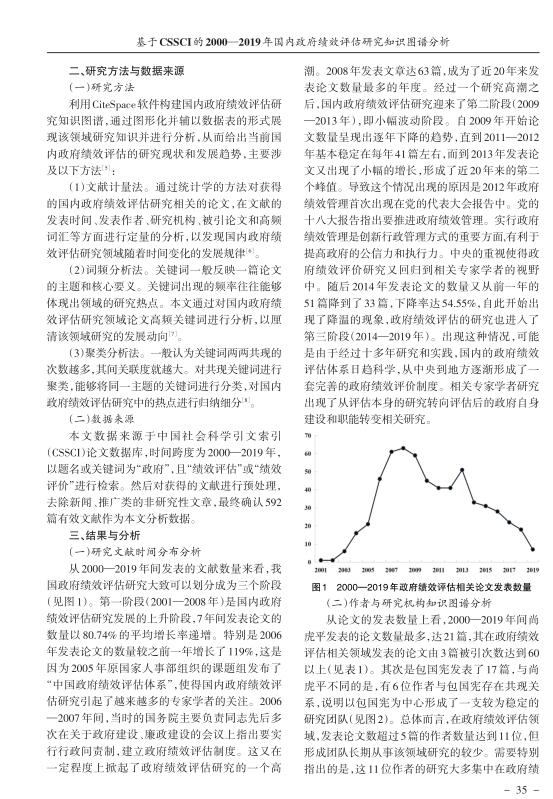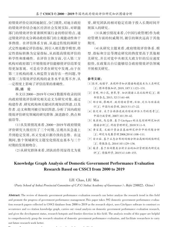 导读:无形资产评估公司对国内政府绩效评估研究进行综述,可以更好地分析该领域的研究趋势,促进政府绩效管理进步。文章以2000—2019CSSCI数据库收录的592篇国内政府绩效评估技术评估、企业价值评估研究相关论文为研究对象,利用CiteSpace软件构建共现和共引知识图谱,对国内政府绩效评估研究进行可视化分析,给出了该领域的发展现状、研究热点和前沿方向。文章的分析结果有助于对国内政府绩效评估究态势进行全面把握,方便研究人员更好地开展以后的研究工作。