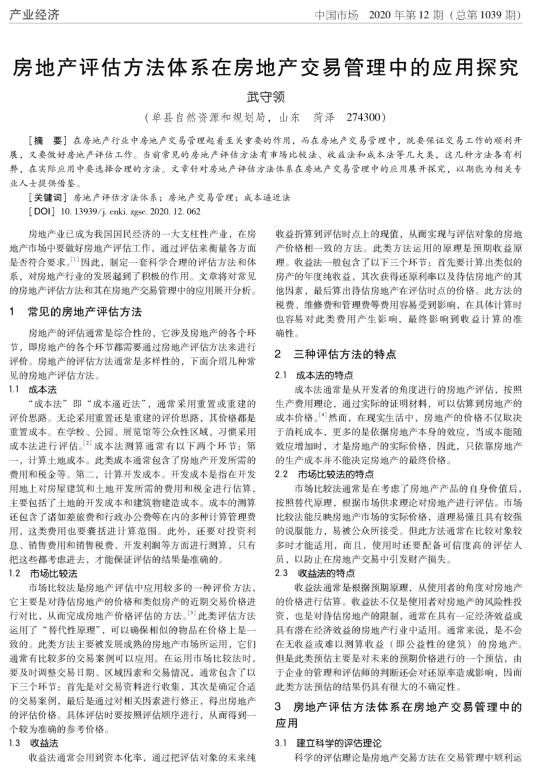 导读:房产评估公司在房地产行业中房地产交易管理起着至关重要的作用,而在房地产交易管理中,房屋估价公司既要保证交易工作的顺利开展,又要做好房产评估、房屋评估工作。当前常见的房地产评估方法有市场比较法、收益法和成本法等几大类,这几种方法各有利弊,在实际应用中要选择合理的方法。文章针对房地产评估方法体系在房地产交易管理中的应用展开探究,以期能为相关专业人士提供借鉴。
