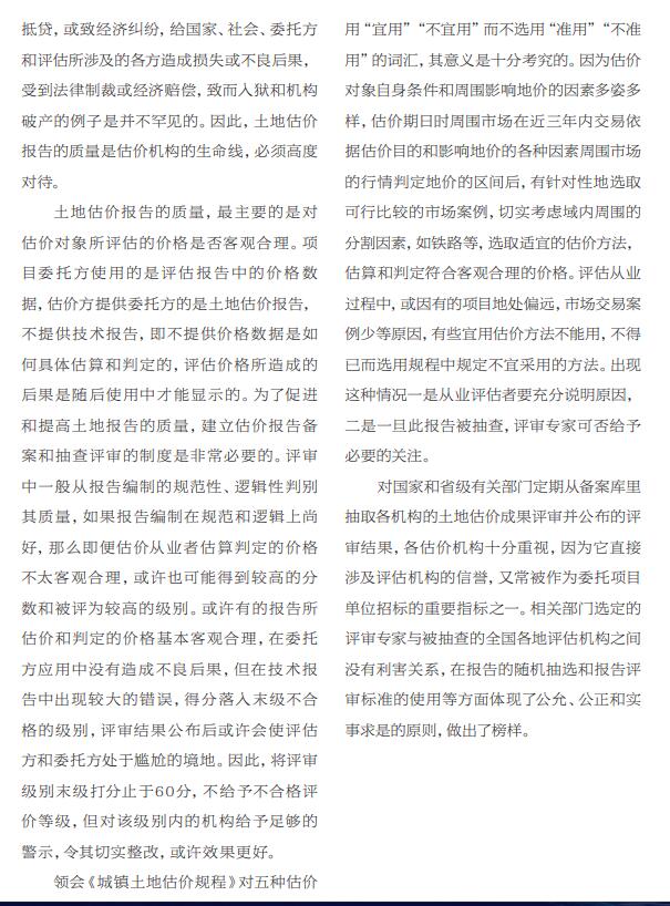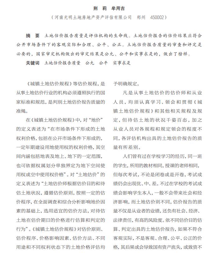 导读:资产评估公司对土地估价报告质量是评估机构的生命线。土地估价报告的土地评估、地价评估结果应符合 公开市场条件下的客观实际和合理、公平、公正。土地估价、房地产评估报告质量的审查和评定是 必要的,国家审定机构做出的审定结果是公允、公平和实事求是的,做出了榜样。