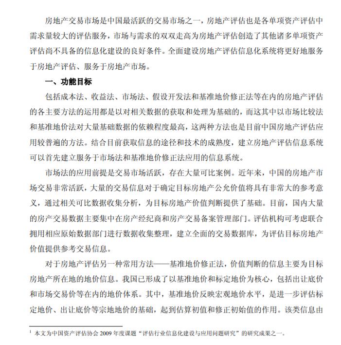 导读:房地产交易市场是中国最活跃的交易市场之一,房地产评估、厂房评估也是评估公司各单项资产评估中 需求量较大的土地评估服务,市场与需求的双双走高为房地产评估创造了其他诸多单项资产 评估尚不具备的信息化建设的良好条件。全面建设房地产评估信息化系统将更好地服务 于房地产评估、服务于房地产市场。(作者:杨志明)