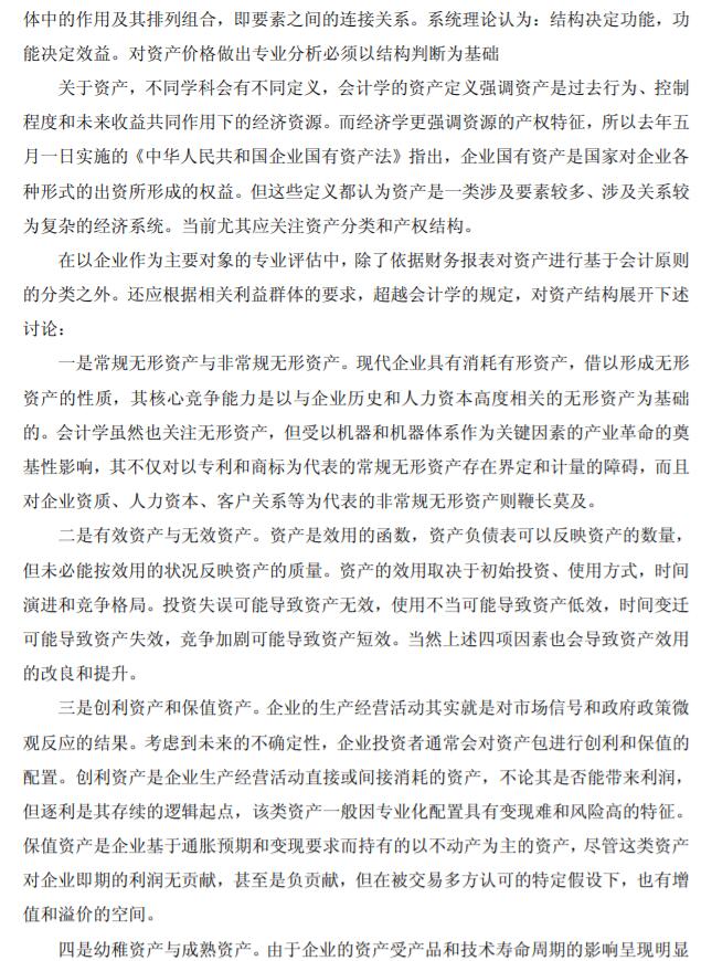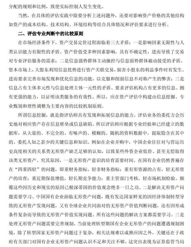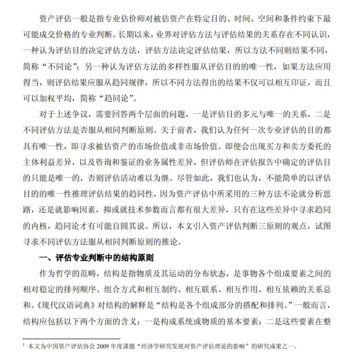 导读:资产评估一般是指专业估价师对抵押评估、转让评估在特定目的、时间、空间和条件约束下最 可能成交价格的专业判断。长期以来,业界对评估方法与评估结果的关系存在不同认识, 一种认为评估目的决定评估方法,商标权评估、专利价格评估方法决定租金评估结果,所以方法不同则结果不同, 简称“不同论”;另一种认为评估方法的多样性服从评估目的的唯一性,如果方法应用 得当,则评估结果应服从趋同规律,所以不同方法得出的结果不仅可以相互印证,而且 可以加权平均,简称“趋同论”。(作者:汪海粟 张世如)
