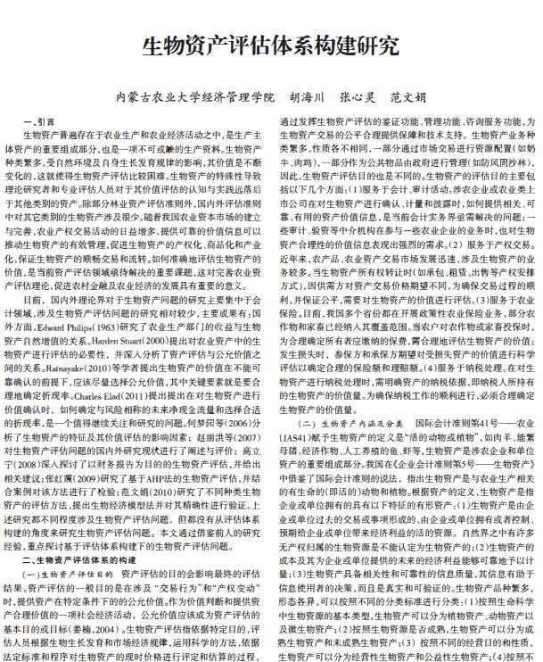导读:生物资产普遍存在于农业生产和农业经济活动之中,是生产主体资产的重要组成部分,也是一项不可或缺的生产资料。生物资产种类繁多,受自然环境及自身生长发育规律的影响,其价值是不断变化的,这就使得生物资产评估、自然资源评估\林木资产评估\鱼塘评估\农产品评估比较困难。生物资产的特殊性导致理论研究者和专业评估人员对于其价值评估的认知与实践远落后于其他类别的资产。除部分林业资产评估准则外,国内外评估准则中对其它类别的生物资产涉及很少。随着我国农业资本市场的建立与完善,农业产权交易活动的日益增多,提供可靠的价值信息可以推动生物资产的有效管理,促进生物资产的产权化、商品化和产业化,保证生物资产的顺畅交易和流转。如何准确地评估生物资产的价值,是当前资产评估领域亟待解决的重要课题,这对完善农业资产评估理论,促进农村金融及农业经济的发展具有重要的意义。(作者:胡海川 张心灵 范文娟)   |