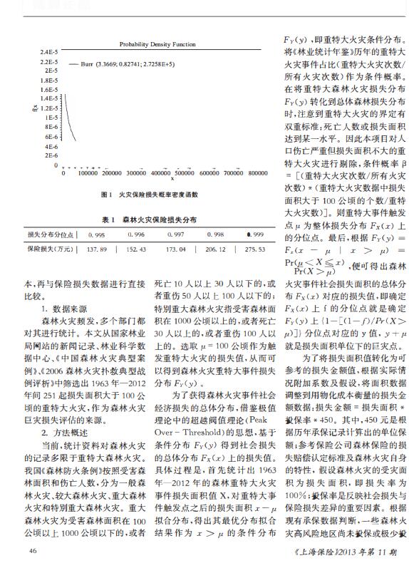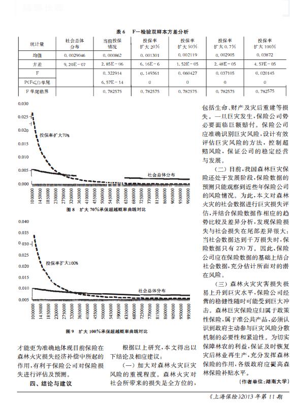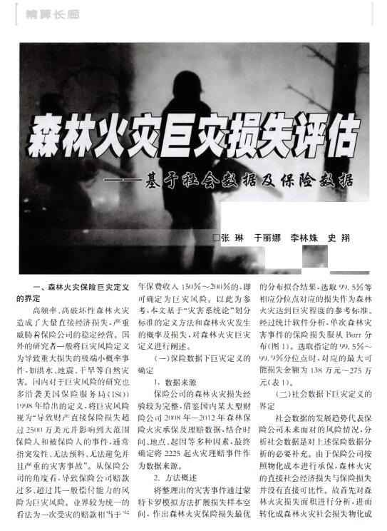 导读:社会数据应作为保险数据损失分析的重要补充,以实现更完整的森林火灾巨灾损失评估,农产品评估,苗木评估。由于目前社会损失数据的统计资料仅限于重特大森林火灾,无法得到一个精确的整体损失分布,因此财产损失评估公司,专业评估公司也不能得到相应的整体超越概率曲线。本文依据极值理论,在得出的尾部巨灾损失分布Pareto2上进行蒙特卡罗模拟,得到大量的损失及对应的发生概率,用条件分布的理论将尾部损失分布上的点调整到整体损失分布上,随后求出模拟损失在整体分布上相应的超越概率,对超过巨灾水平的损失值及超越概率画出散点图,再进行趋势回归,便得出选定巨灾水平下的超越概率曲线。采用上述方法得到的社会数据的超越概率曲线为幕函数的形式(图5)'表达式为y= 2.866x-o·45。从回归模型的分析结果(表4)可以看出,接近1表示方程中变量X对Y的解释程度很高;显著性水平在0.05以下表示回归方程的线性关系显著;F检验通过,回归方程整体显著。因此,图5超越概率曲线较好地评估并预测了森林火灾社会巨灾损失水平。   |